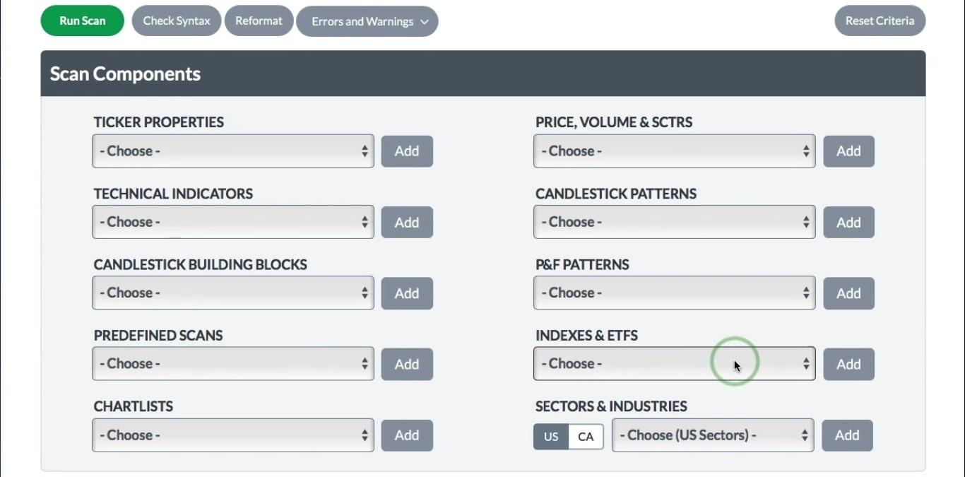 StockCharts has both Standard Scan Workbench and our Advanced Scan Workbench that you can use to create scans by choosing pre-created scan clauses.