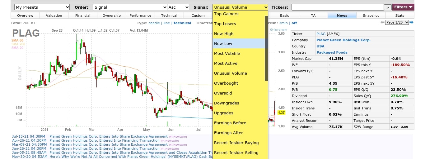 On the other hand, Finviz’s “News” feature is just a general flow of stock market news that cannot be filtered and are mostly not actionable.