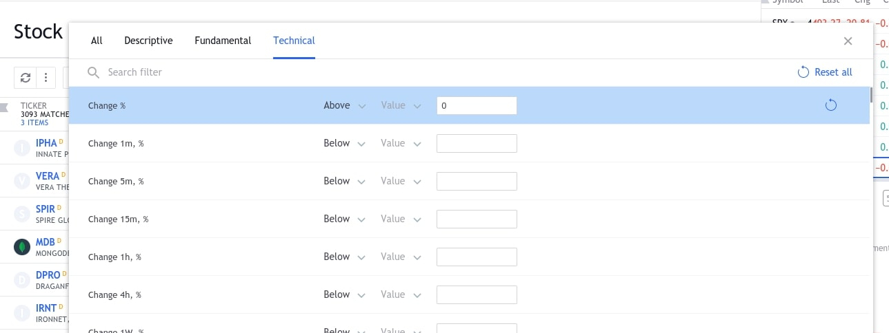 Also, TradingView’s technical filters are rather basic and limited as shown below.