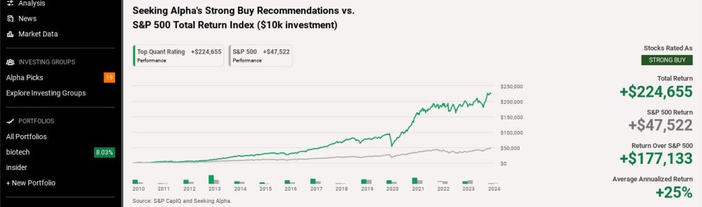 From 2010 to April 2024, Seeking Alpha Strong Buy achieved a total return of $224,655 based on $10,000 in investment capital while the S&P 500 achieved a total return of $47,522.
