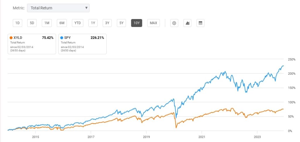 As you can see, XYLD underperformed the S&P 500 index significantly over the past 10 years.