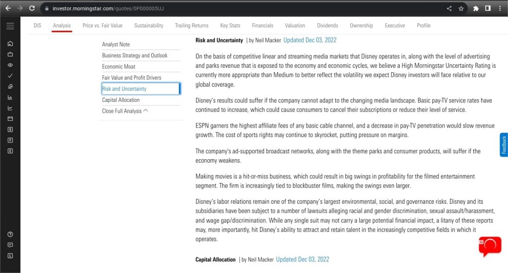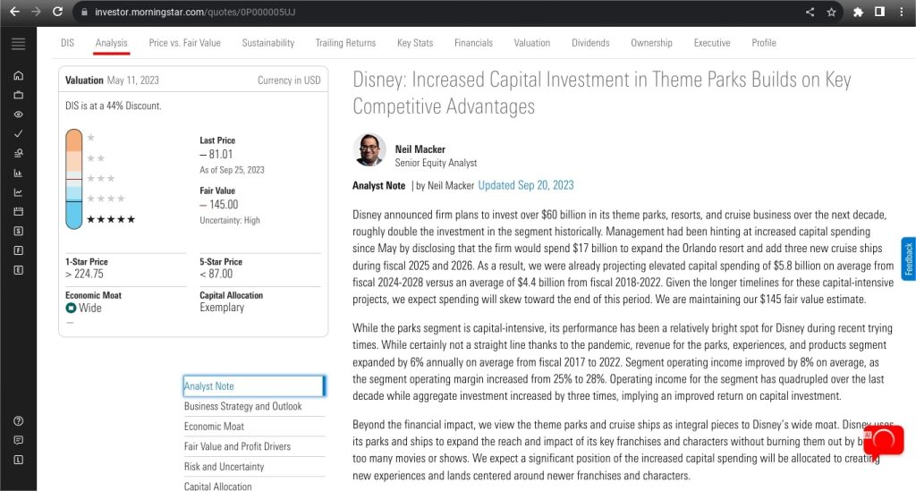For example, below is Morningstar’s estimated fair value for Walt Disney.