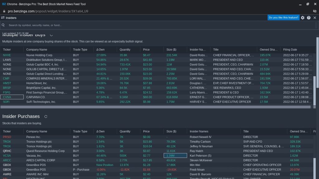 What I love especially about Benzinga Pro is that you can get all the insider buy and sell transactions.