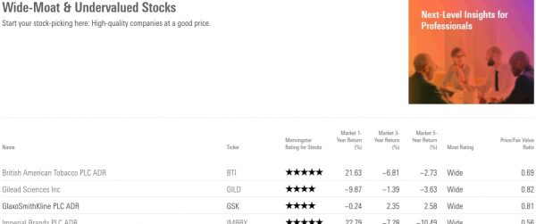 Personally, I like its “Wide-Moat + Undervalued Stock” list which shows you all the stocks with a Wide Moat Rating and a Star Rating of 4 or 5 stars.