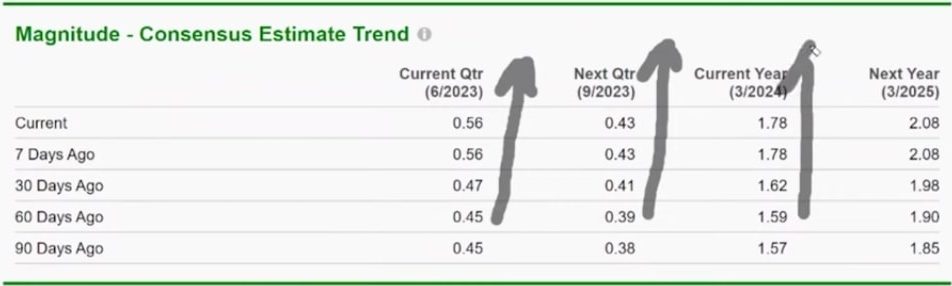 Most importantly, he likes to see earnings estimates revised upwards consecutively for the past 3 quarters.