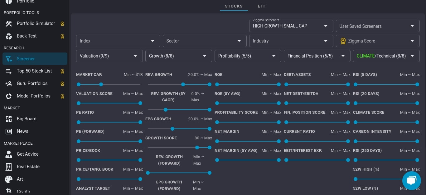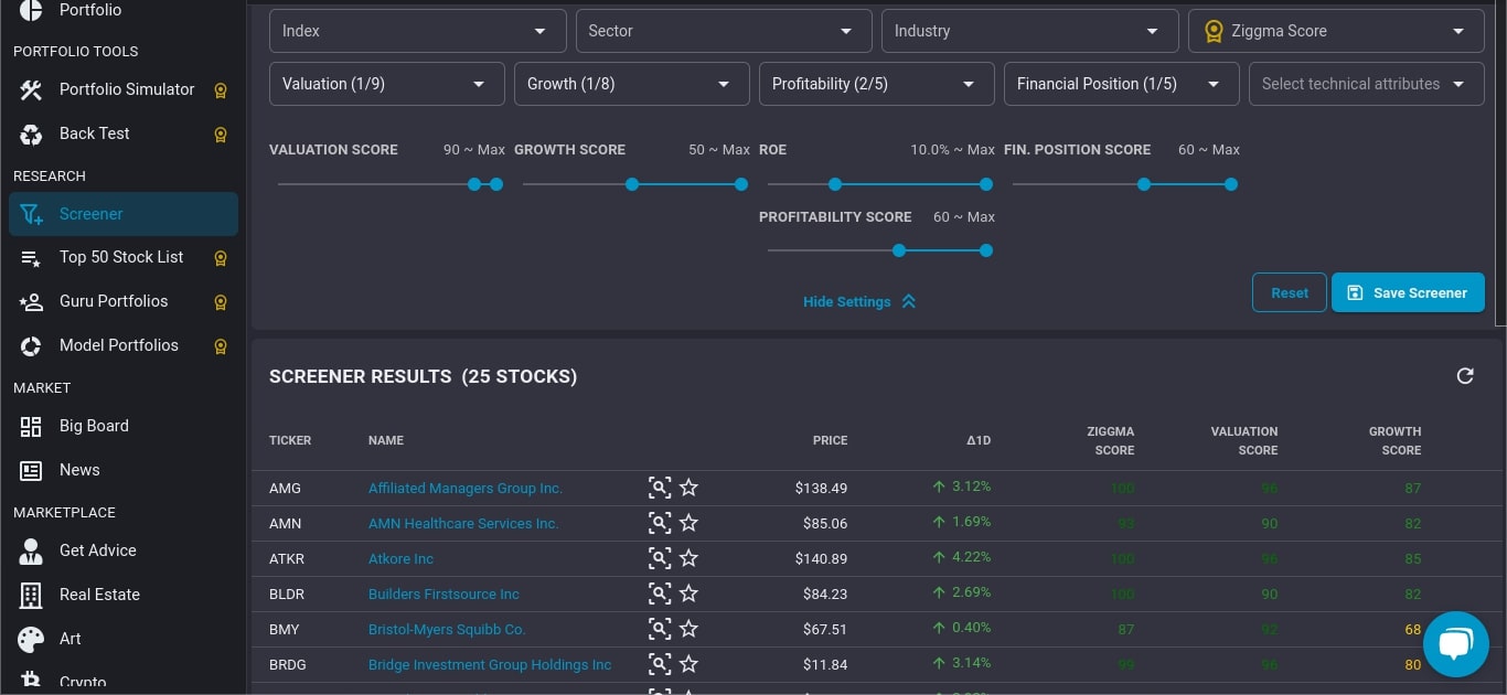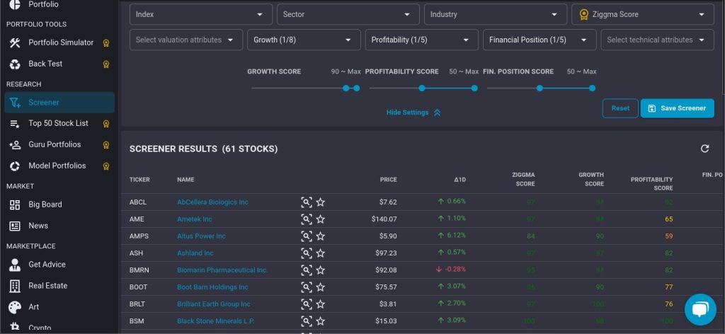 Ziggma has a quite decent stock screener with main filters such as Sector, Industry, Ziggma Score, Valuation, Growth, Profitability, Financial Position, and Technical Indicator.